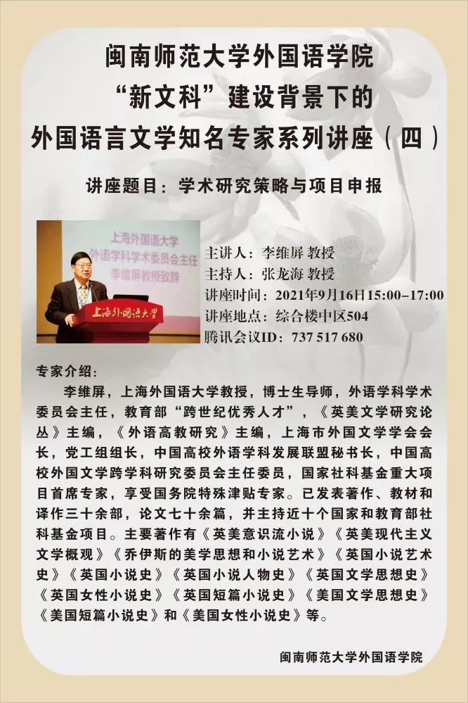 闽南师范大学外国语学院积极响应国家建设 “新文科” 的精神,针对学院学科现状及发展需求,经多方论证与研讨,特推出“新文科” 建设背景下的外国语言文学知名专家系列讲座”。闽南师范大学外国语学院将会邀请学界知名专家就 “新文科建设” 相关议题开展学术讲座,力争通过 “专家指导、思路调整、业务强化” 的立体互动模式,加快闽南师范大学外国语学院 “新文科建设” 的步伐。