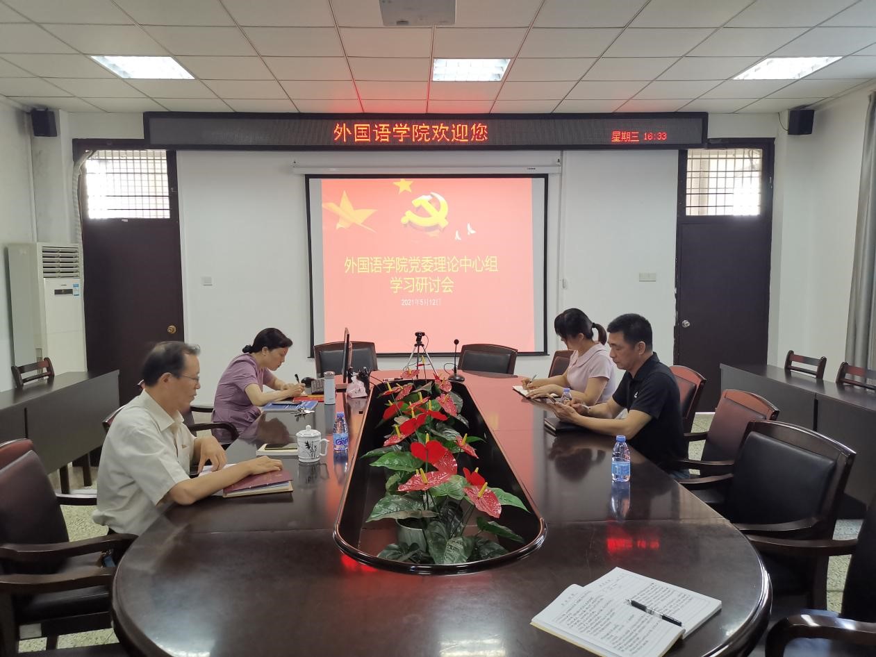 5月12日下午,外国语学院在综合楼中区505会议室召开党委理论学习中心组学习研讨会,本次会议由外国语学院院长吴玉玲作专题报告,学院党员领导班子成员、党委委员参与学习研讨。
