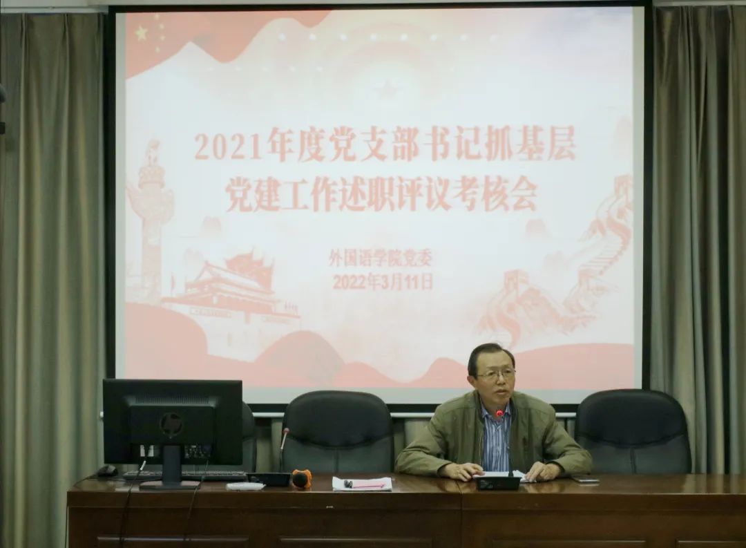 3月11日下午,外国语学院在综中504会议室召开2021年度党支部书记抓基层党建工作述职评议考核会议,学院党委委员、各党支部书记以及支委代表参会,会议由学院党委书记吴晓峰主持。