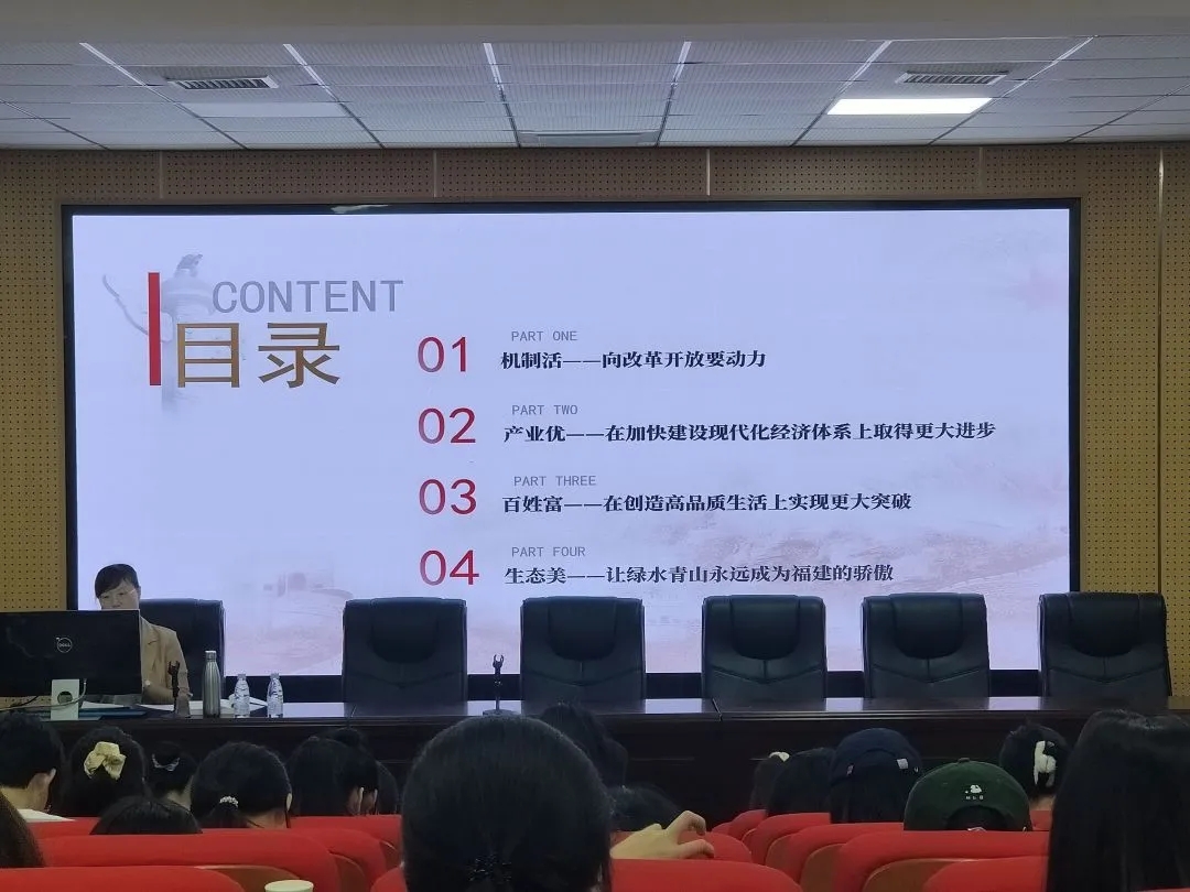 砥砺践行初心使命,奋力擘画宏伟蓝图。党的十八大以来,习近平总书记多次到福建考察调研,谋划建设“机制活、产业优、百姓富、生态美”新福建的宏伟蓝图,提出“四个更大”的重要要求,“三个如何”的殷切嘱托,为福建发展指明了前进方向、注入了强大动力。陈晓蕾老师表明,要在深学细照、探源溯源、笃行实干中深刻领会“两个确立”的决定性意义,深刻感悟自我革命精神,在加强党的自身建设中夯实执政根基,奋力把习近平总书记擘画的新福建蓝图变为美好现实。