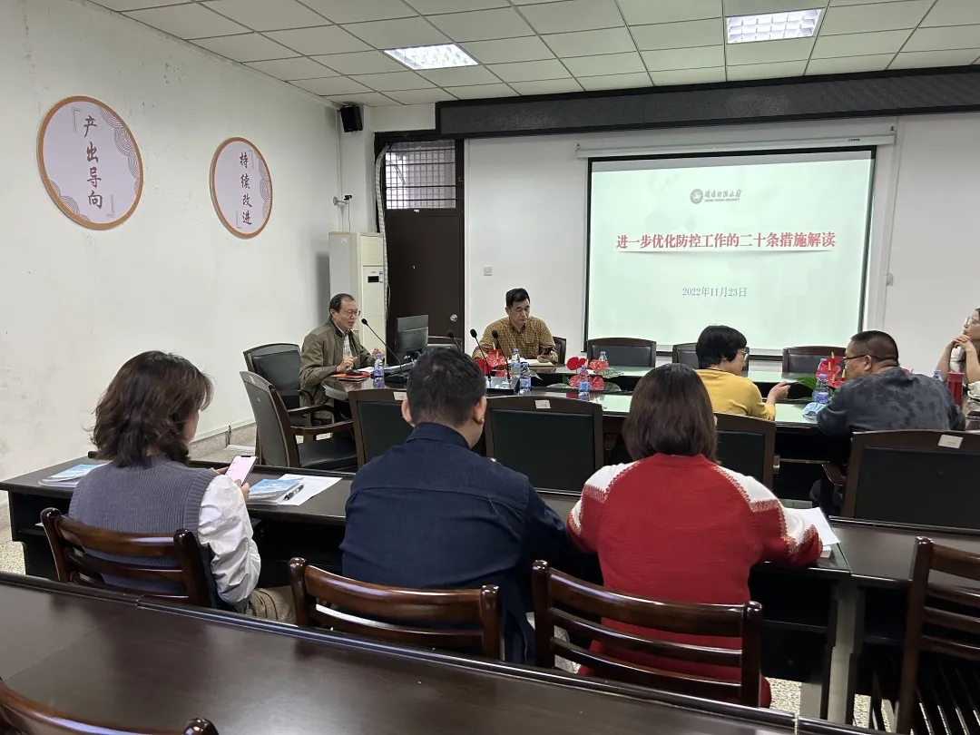 会议组织学习了关于进一步优化防控工作的二十条措施,吴晓峰书记强调要根据属地管理原则,立足于学校的实际情况,严格落实师生疫情防控一体化管理,系主任和辅导员要及时传达好学校新的防控要求,让全体师生了解当前疫情形势的严峻性,严格遵守校园防控规定,提高疫情防控的科学性和精准性。对于外卖配送容易造成食品污染等突出问题,要加强引导鼓励学生食堂就餐,守好校园安全防线,共同筑牢防疫屏障,携手打赢这场疫情防控阻击战。