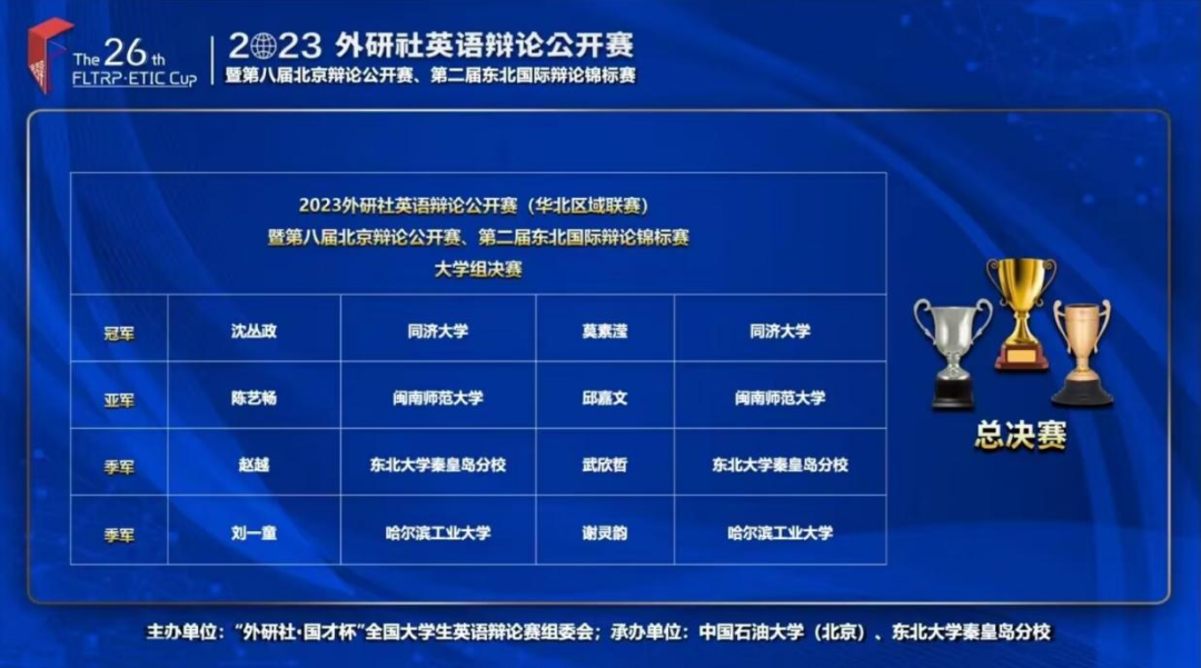 8月26日至27日,“外研社·国才杯”全国大学生英语辩论赛组委会联合中国石油大学(北京)、东北大学秦皇岛分校举办2023外研社英语辩论公开赛(华北区域联赛)暨第八届北京辩论公开赛、第二届东北国际辩论锦标赛。