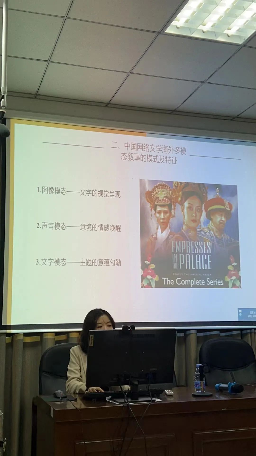 邵教授分析了中国网络文学的发展和演变以及在海外的发展模式。她表示,书本媒介让步于屏幕媒介,并非只关注文本语言,而是要转向关注非语言因素,将视觉、听觉和情感维度纳入网络文学多模态叙事。在分析中国网络文学海外多模态叙事的模式和特征时,邵璐教授以《甄嬛传》为例,从图像模态、声音模态及文字模态等方面进行探讨分析。
