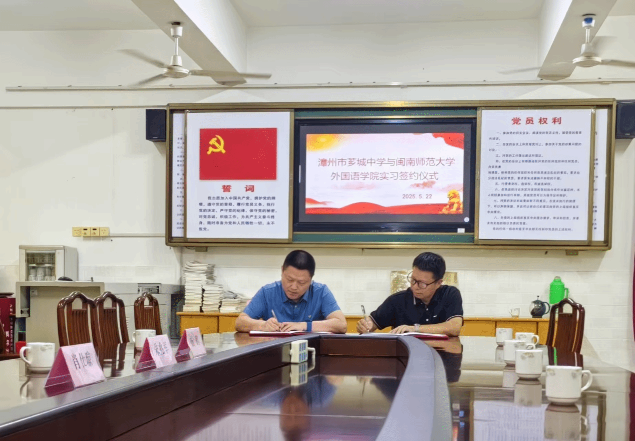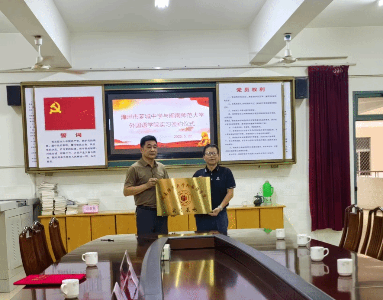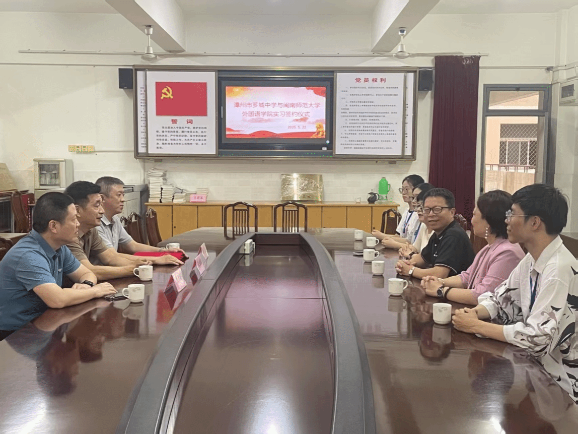 为深化校地协同育人机制,推动师范教育高质量发展,5月22日下午,闽南师范大学外国语学院与漳州芗城中学教育实习基地签约授牌仪式在芗城中学成功举行。外国语学院副书记朱兆军、副院长肖仕琼教授、翻译系杨鹏副教授,芗城中学校长杨卫乾、政治处主任陈小妮等出席活动。