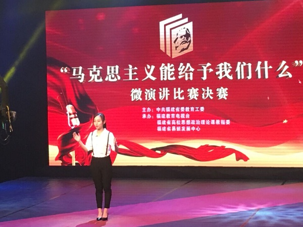 11月3日,由福建省委教育工委主办的“马克思主义能够给予我们什么”微演讲决赛在福建教育电视台演播厅举行。来自全省各高校的30名学子同台竞技,我院14英师3班廖超颖荣获得了三等奖。