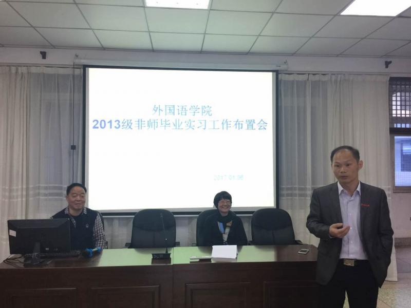 2017年1月6日上午,外国语学院日语系召开2013级学生专业实习工作布置会。院党委书记黄伟东到会并讲话,日语系全体教师、2013级全体学生参加会议。副院长苏建华主持会议。