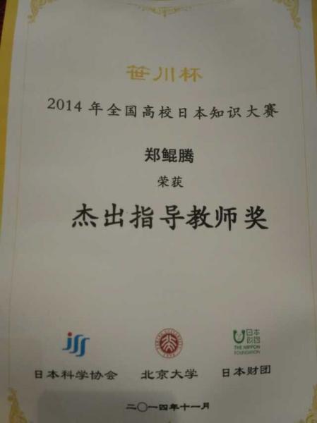 2014年11月21-23日,我校外国语学院日语系2012级刘梦思、万春波、刘若斓三位同学在北京大学参加2014笹川杯全国高校日本知识大赛。 刘梦思同学在全国89所高校中脱颖而出,获得个人赛第三名的佳绩,并获得日本科学协会提供全程费用、为期8天的赴日参观学习邀请。团体赛中,刘梦思、万春波、刘若斓三位 学获优秀奖。指导教师郑鲲腾获杰出指导教师奖。 本次大赛汇集了包括北大、清华、复旦、上外、广外、南京大学、大连外国语等著名高校在内的89所高校。
