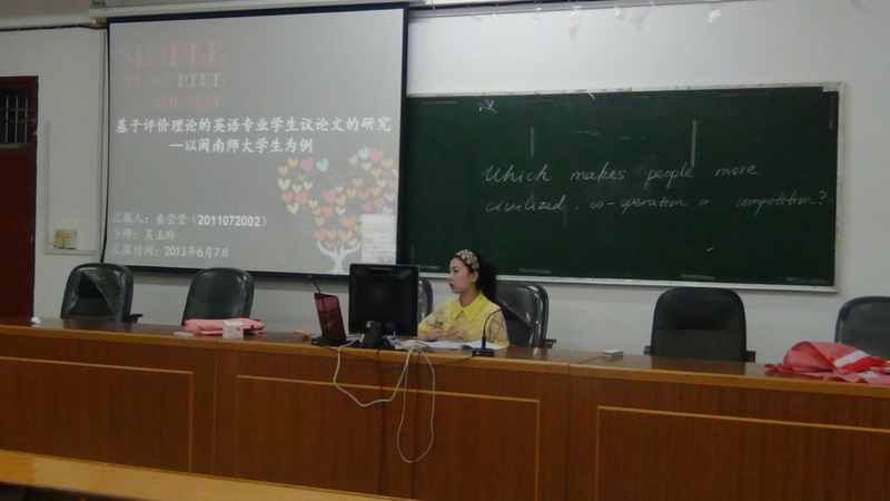 本次论坛的主题是“基于评价理论的英语专业学生议论文研究—以闽南师范大学学生为例”,主要通过应用马丁评价理论对英语专业学生议论文写作进行研究。研究者收集了闽南师范大学英语专业大四103份作文来进行质性研究,其中包括:介入资源、情感词汇及非情感词汇的分析。该研究还提出几点教学启示和建议,如老师要教会学生围绕关键性的词汇写作;学生应进行词汇训练、句法训练、篇章训练等,同时,她还针对论文写作中可能遇到的问题给在场的同学们提供了许多值得借鉴的经验。