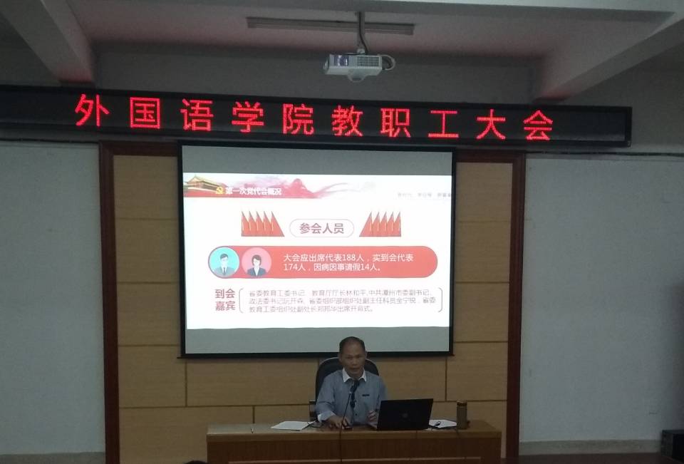 10月18日下午,我院在逸夫楼梯教二召开教职工大会,会议传达中共闽南师范大学第一次党代会精神。学院党委书记黄伟东同志主持会议,全院教职工参加会议。