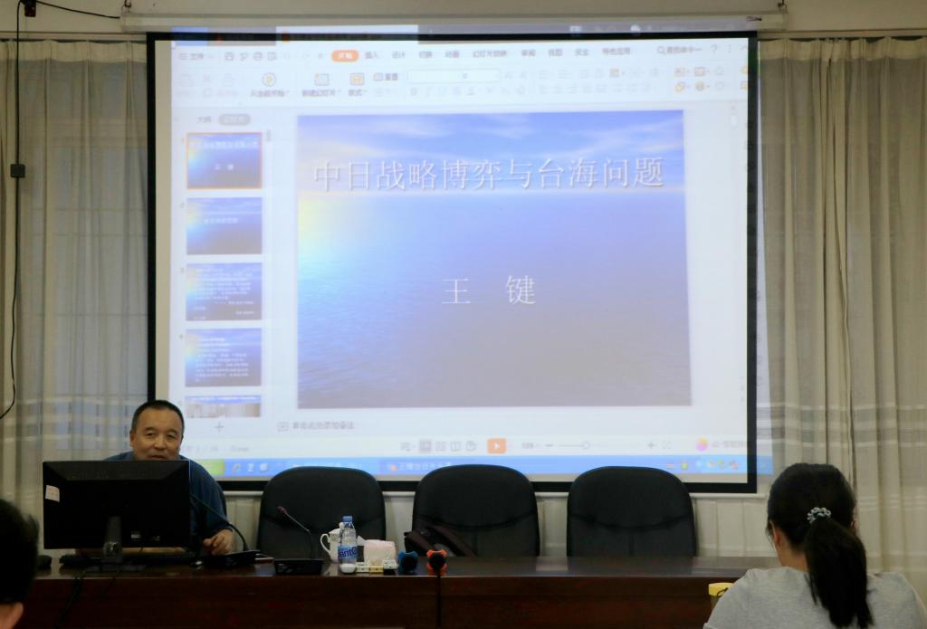 王键教授围绕“台湾问题的由来”、“当前台日关系格局”、“当前国际形势与台湾问题”三方面内容进行讲解,深入剖析当前台日关系实质,采用图文对照的方式向同学们展示中日、台日、两岸关系发展历程,以台日之间的矛盾、纠纷等详实事例全面分析中日关系战略性改善的时代背景下,台日关系跋胡疐尾的复杂态势。谈及台湾问题时,王教授列举《反分裂国家法》、《国家安全法》、习近平总书记在《告台湾同胞书》发表四十周年纪念会上的讲话等内容,鼓励同学们举青春之力推进祖国和平统一大业。最后,王教授就台海局势、中日关系等问题与师生们互动交流。