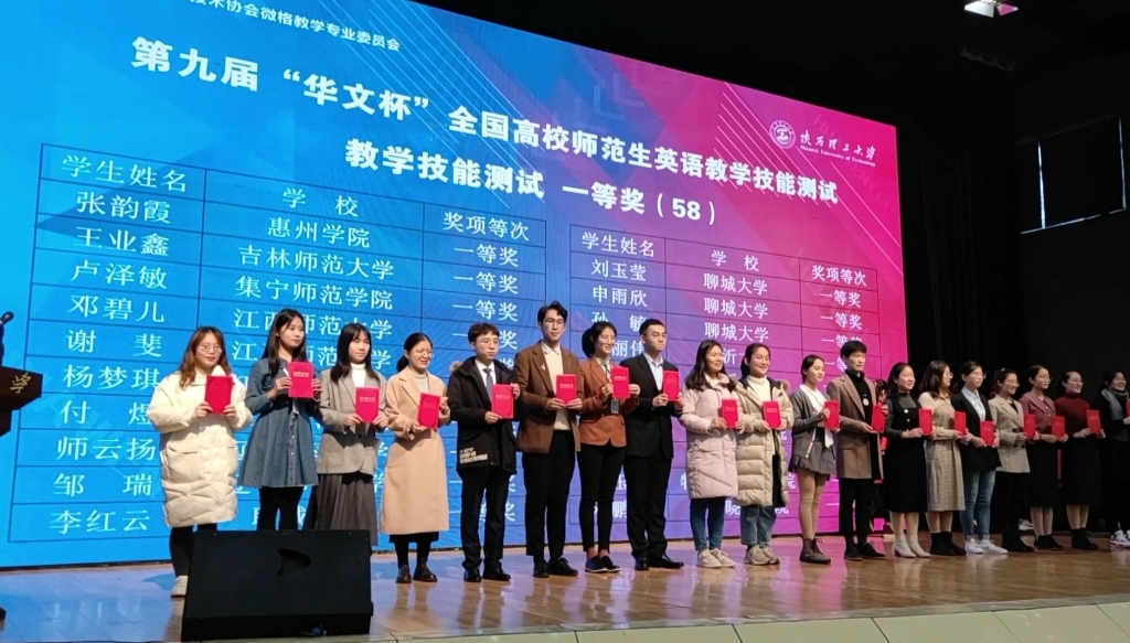 2019年12月6日至12月8日,第九届“华文杯”全国高校师范生英语教学技能测试暨英语教学论坛于陕西理工大学举行。经过激烈角逐,与来自全国的62所高校的298名选手同台竞技,闽南师范大学外国语学院的选手们在陈彩虹、江晶晶老师的指导下获得优异成绩。在教学技能展示中,我院2018级英师5班周梓沅获一等奖,并作为赛场成绩排名第一的选手在闭幕式上进行技能展示。2017级英师4班陈烨、苏婷及2019级英语教育硕士付建慧、龙泉宇获二等奖;在教学设计环节中,付建慧获一等奖,龙泉宇、周梓沅、苏婷获三等奖。