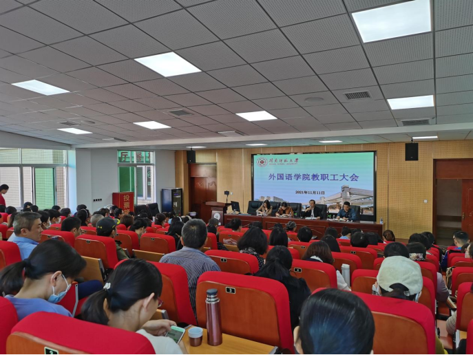 11月11日下午,外国语学院在逸夫楼梯教二召开全院教职工大会。会议由党委书记吴晓峰主持,学院班子成员以及外国语学院全体教职工参加了会议。