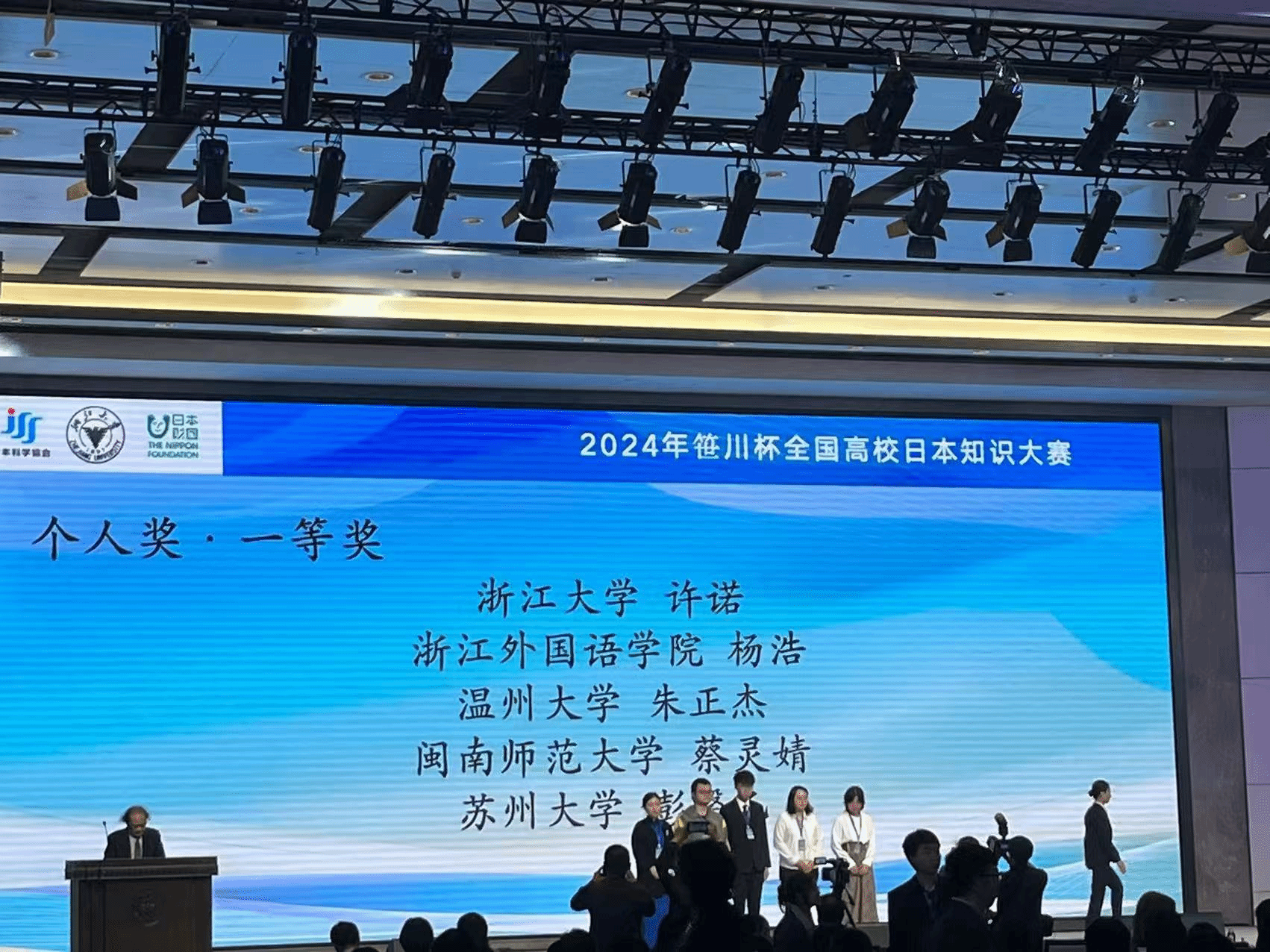 近日,由日本科学协会和浙江大学共同主办的“2024年笹川杯全国高校日本知识大赛”顺利举行。我院蔡灵婧同学荣获“个人奖一等奖”,团队荣获“团体优秀奖”,陈娴老师荣获“杰出指导教师奖”。