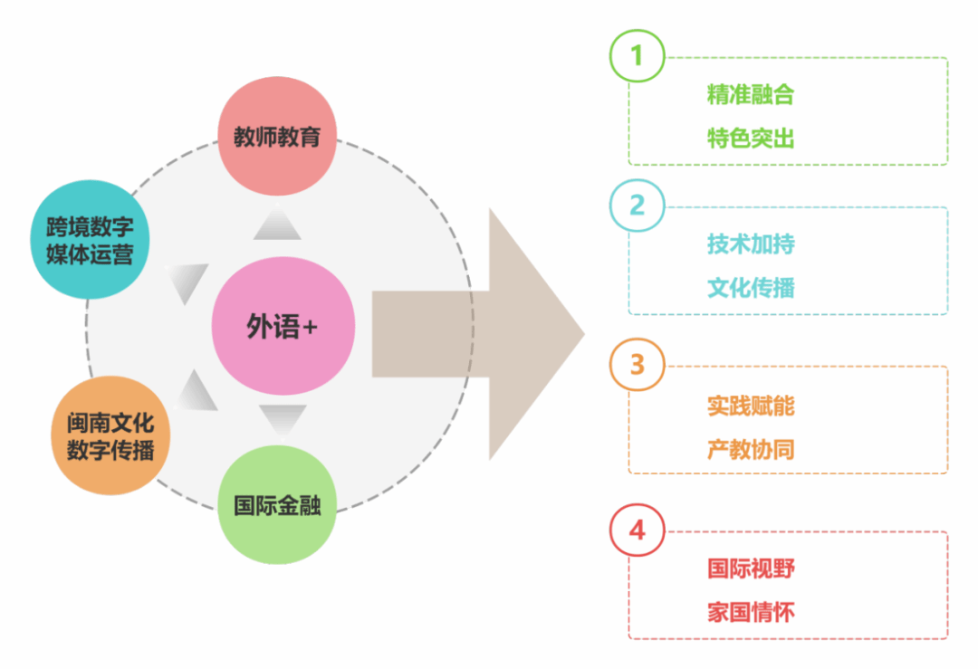 外国语学院现有英语(师范)、商务英语、翻译、日语4个全日制本科专业,学科教学(英语)、翻译专业硕士2个专业学位硕士点,在校本、硕学生1300余人。专业以外语应用能力和跨文化认知素养为根基,依托差异化发展路径,实现专业特色化定位,构建“外语+跨界”特色化育人体系,纵向深化四大融合方向: